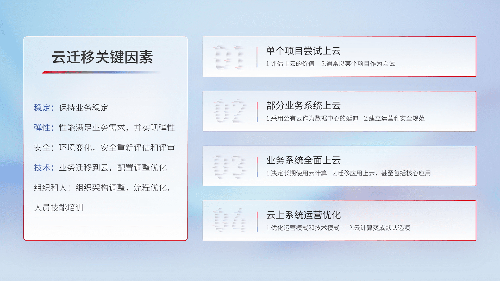结合实际业务,,,从规划设计、、、云平台选型、、、云原生改造、、、、数据迁移、、、、集成交付,,,,迁移全过程为客户识别最佳上云路径,,做好风险识别管理,,,,设计网络架构、、、身份权限、、安全审计合规、、操作审计、、日志审计、、、、监控告警策略、、、、多站点容灾设计等,,,对云上基础设施进行整体规划,,提升IT治理水平,,,,以满足弹性、、高可用、、、高性能的需求。。。