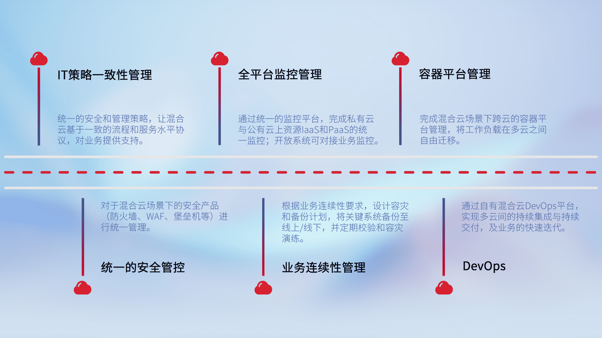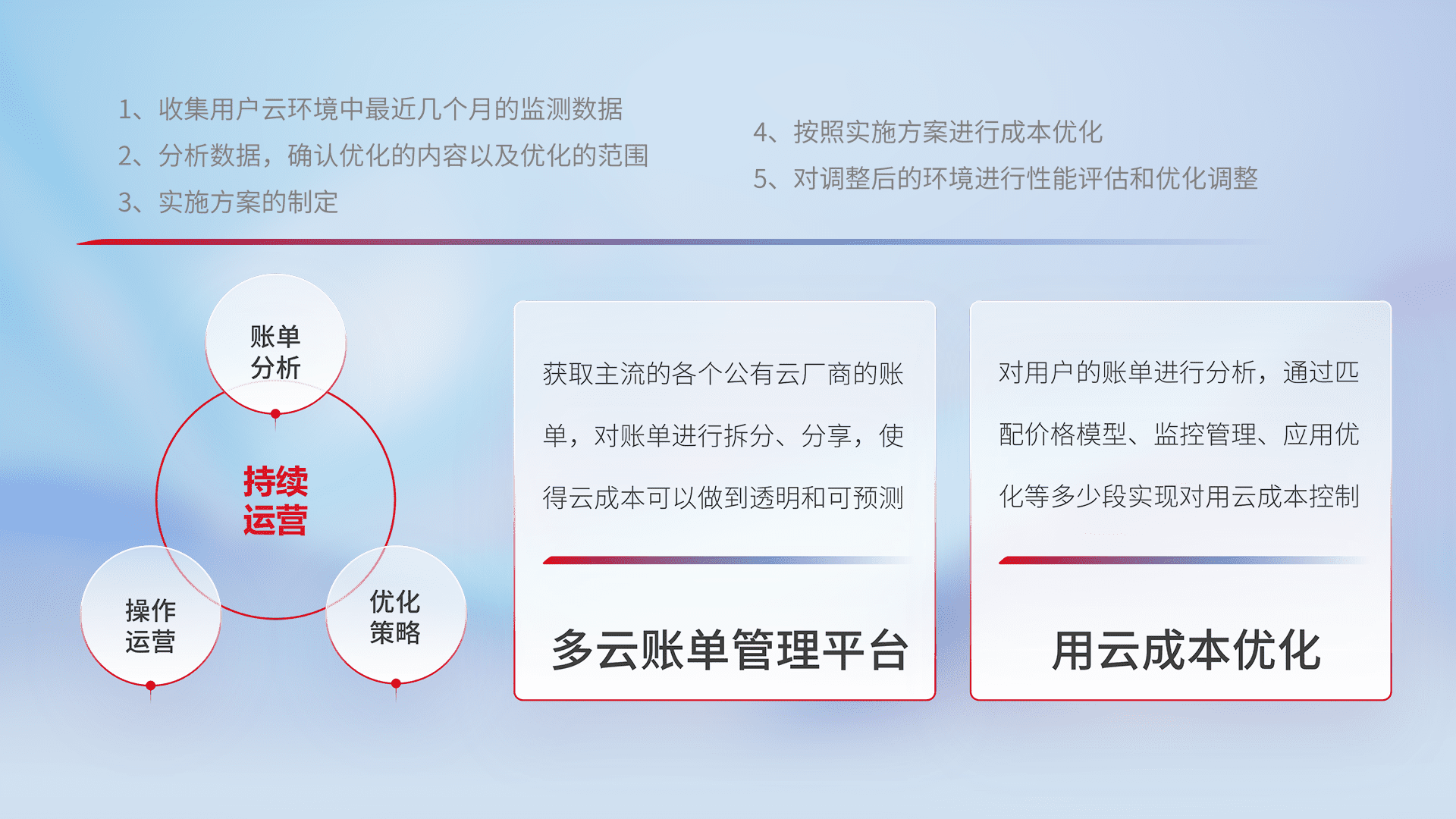 通过多云纳管,,,以统一的资源数据模型把客户的云资源进行抽象和封装,,,进而实现对多云资源的统一操作,,保障云资源管理的可靠性、、、、稳定性与可用性。。量身定制化运维内容,,,配置、、、开发运维、、、、补丁管理、、备份、、监控、、、、认证和访问管理、、、审计和日常巡检等,,保障在用云过程中的可靠度,,,稳定度以及高可用率。。。