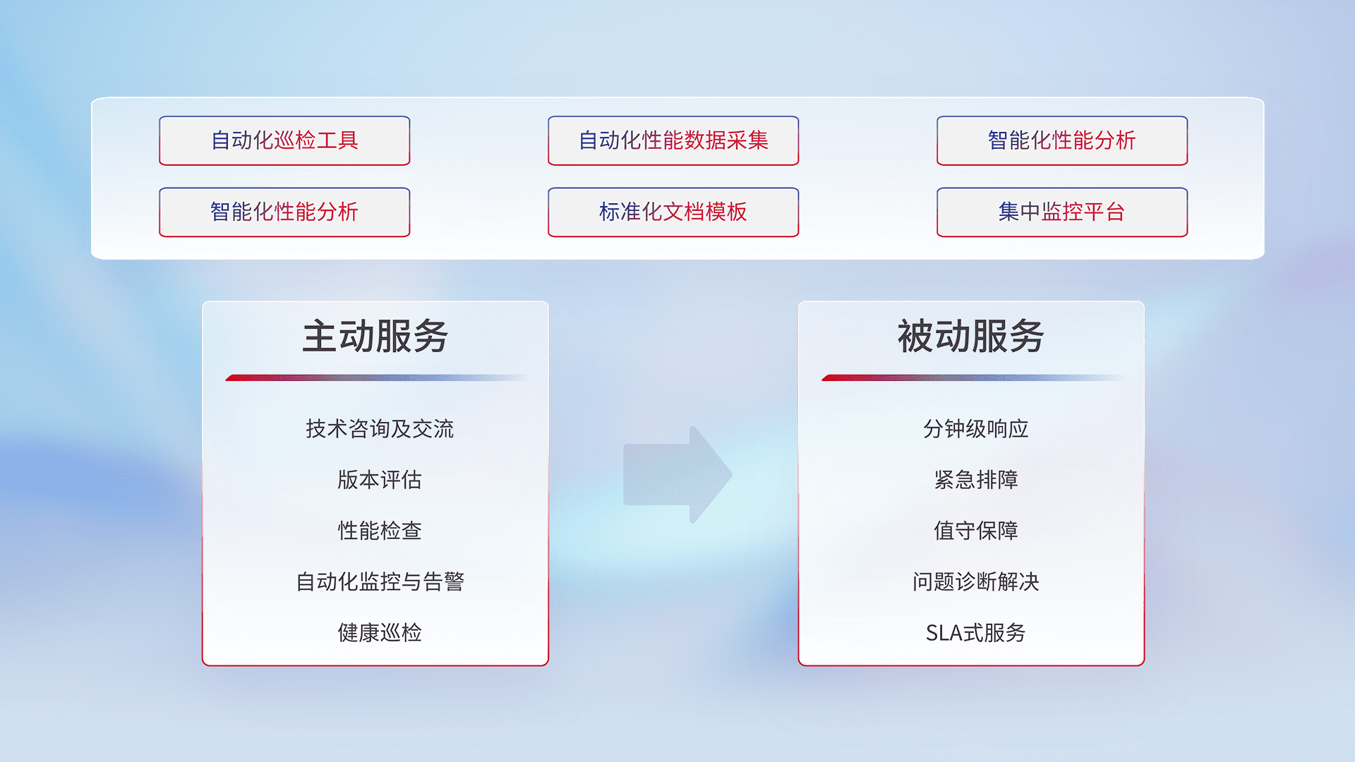 智能化工具和标准化文档,,,,保障服务质量,,,提供主动服务(包含技术咨询、、、、版本评估、、、性能检查、、、自动化监控与告警、、健康巡检)和被动服务包含(分钟级响应、、紧急排障、、值守保障、、、问题诊断解决、、、SLA服务)。。。。
