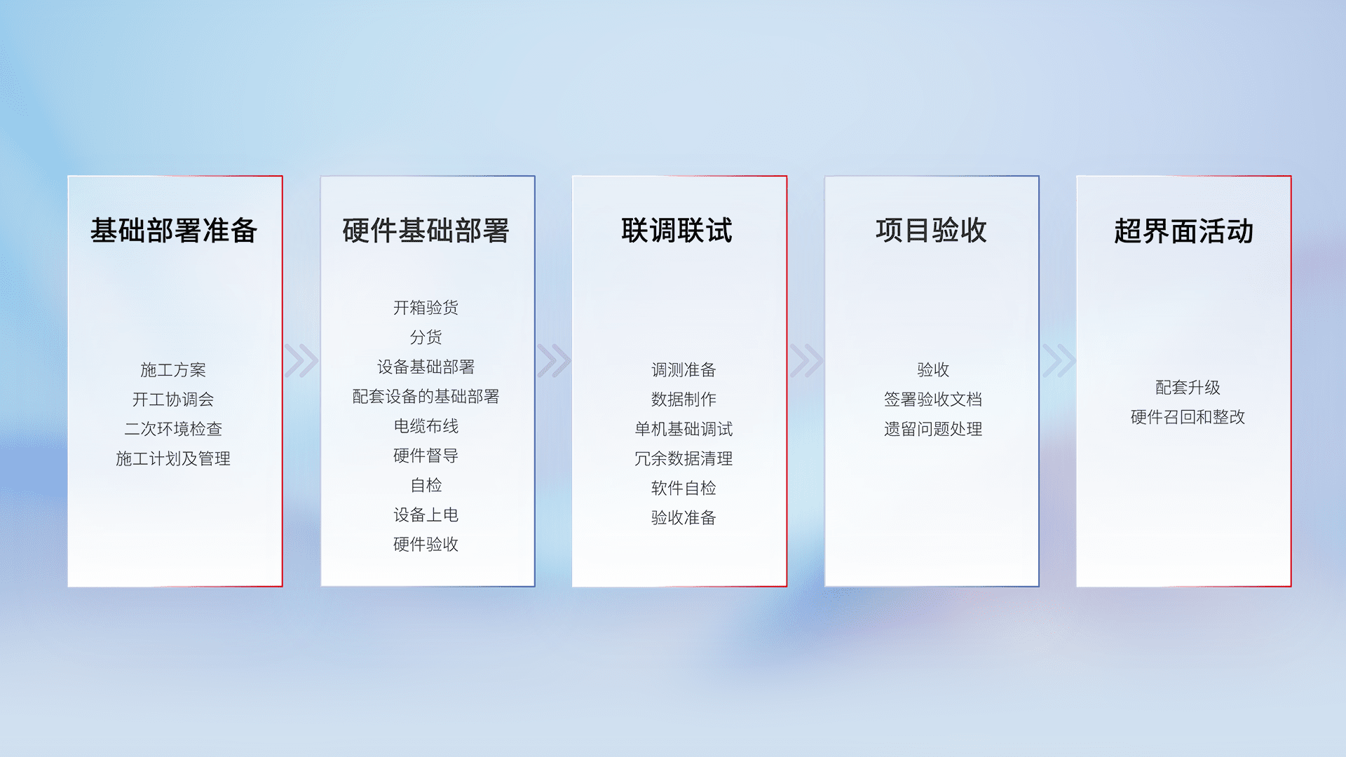 从基础部署准备、、、硬件基础部署、、、、联调联试、、、、项目验收、、、、越界面活动的全过程可追溯,,保证施工质量和进度。。。。